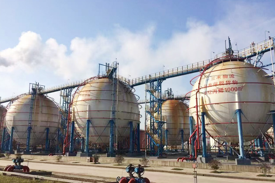 公司總投資6.5億元,目前已建成12.1萬m3化學品罐區(qū)(其中常溫壓力球罐2000 m314座、3000 m3球罐4座、1000 m3球罐1座;常壓拱頂罐5000 m312座、2000 m3拱頂罐10座)。可用于存儲丙烯、丙烷、正丁烷、異丁烷、C4、丙烯酸、丙烯酸丁酯、碳酸二甲酯、 丙三醇、氫氧化鈉溶液、乙醇、丙醇、丁醇、鄰二甲苯、二甲苯(混)、C9、 C10、芳烴溶劑油、 三氯甲烷、柴油等數(shù)十種危險化學品。